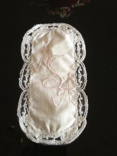 · Using white embroidery and bobbin thread, embroider colors 3 and 4, creating the lace edging. Lace will sew directly onto cotton bookmark fabric.