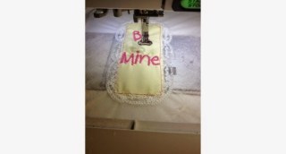 · After adding your initials, name or message, slide 6”x8” cotton fabric beneath hoop, centering fabric to design.