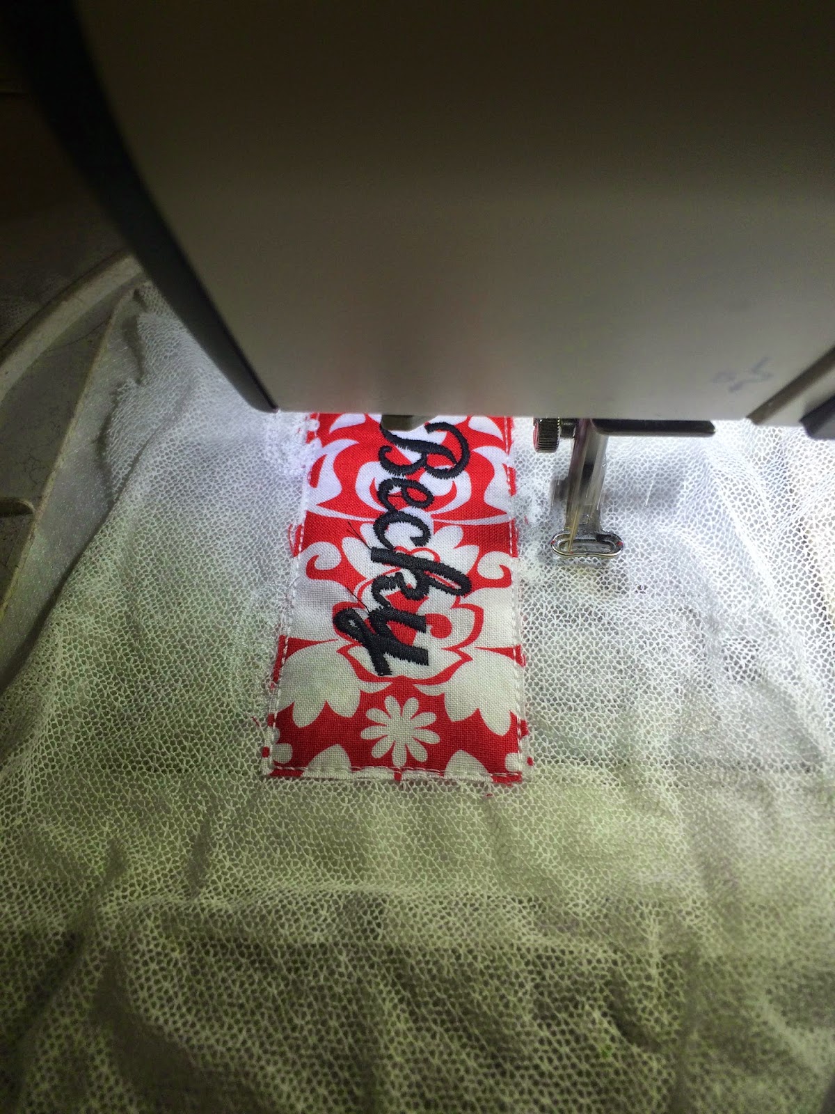 · Place tulle bridal netting on top of wash-n-gone embroidery interfacing and hoop.