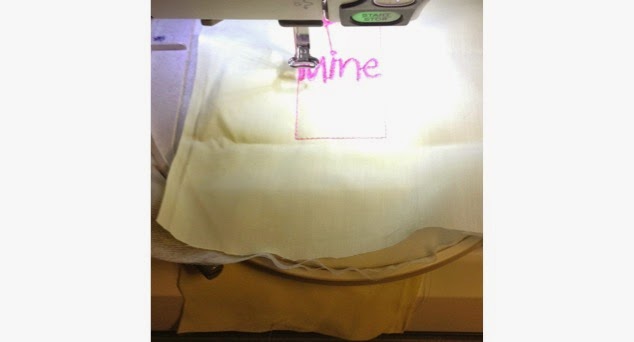 · After adding your initials, name or message, slide 6”x8” cotton fabric beneath hoop, centering fabric to design.