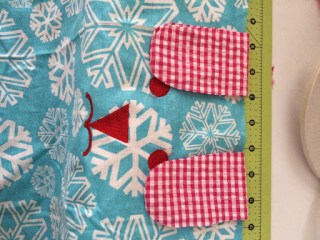 Pin puppy ears to top of fabric allowing the ears to touch the eyes. Straight stitch across top.