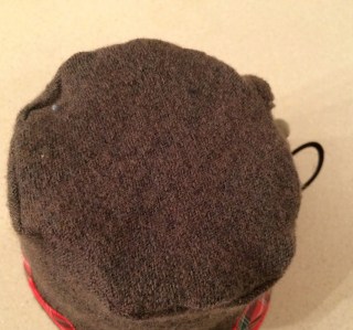 To create the button fastener, sandwich the hair elastic between the wool and the t-shirt strip.Sew using stretch stitch.