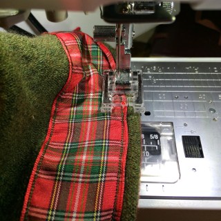 To attach ribbon trim, measure enough ribbon to reach from end of sweater top to button. Sew on using stretch stitch.
