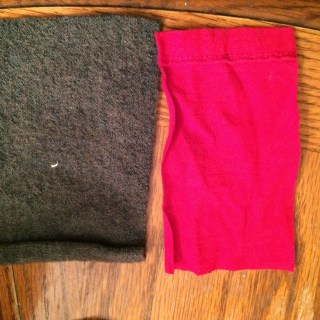 Cut two 1″ strips of t-shirt fabric the height of your piece of wool