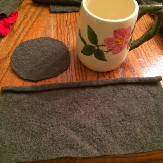 To create the circular bottom of your mug sweater, first place wool circle on the bottom center of your mug sweater, right sides together.