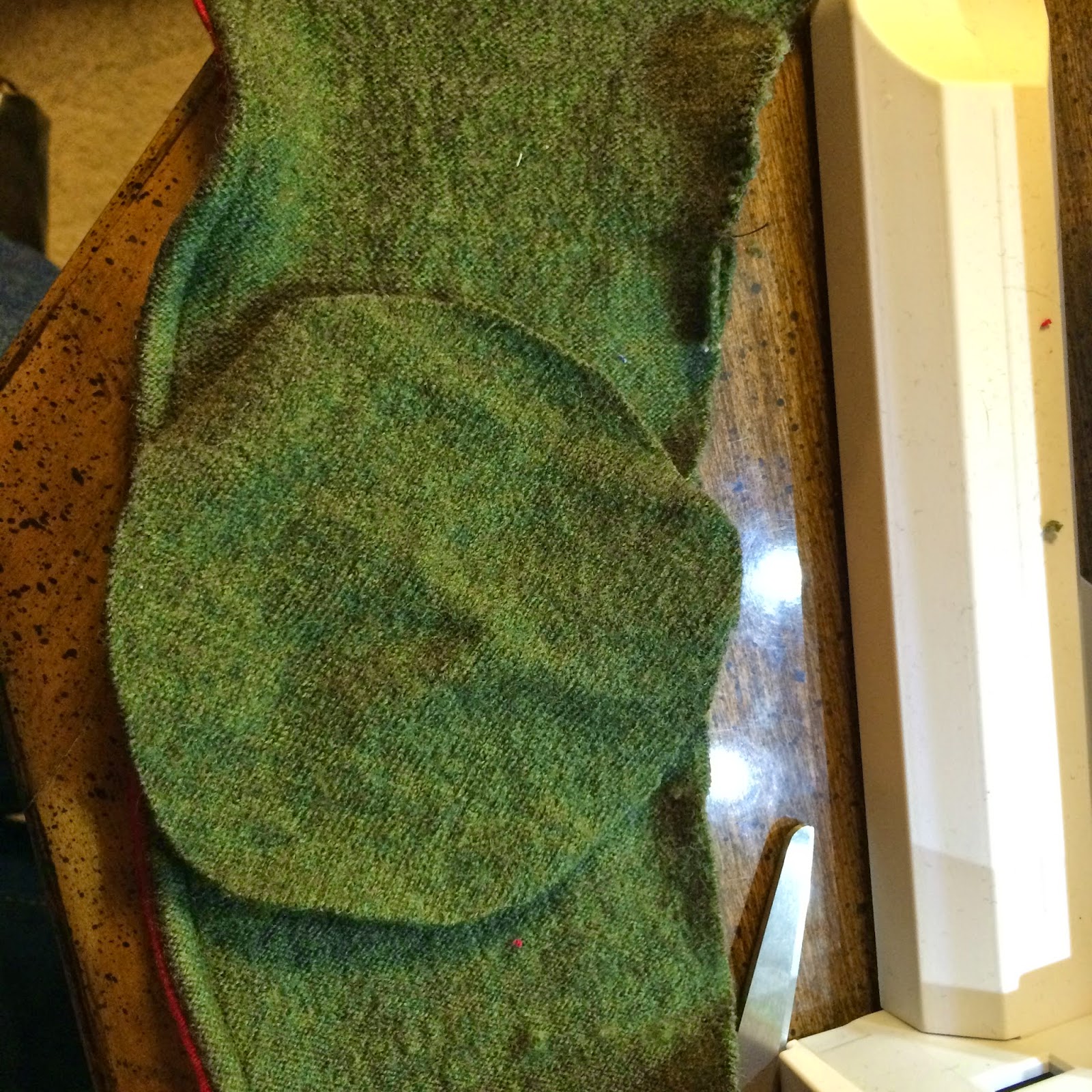 To create the circular bottom of your mug sweater, first place wool circle on the bottom center of your mug sweater, right sides together.