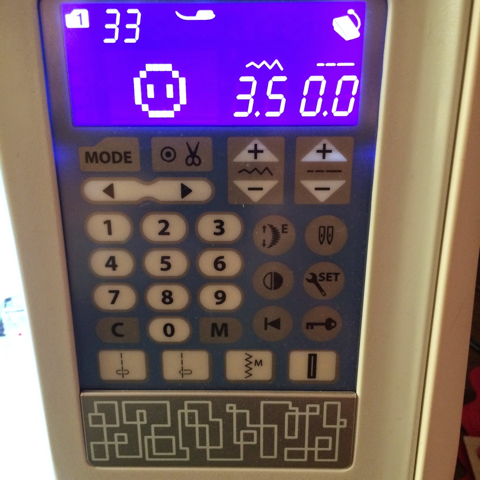 Attach your button foot, drop your feed dogs, and choose the button sewing stitch. On the Skyline S5, it is Mode 1, stitch 33