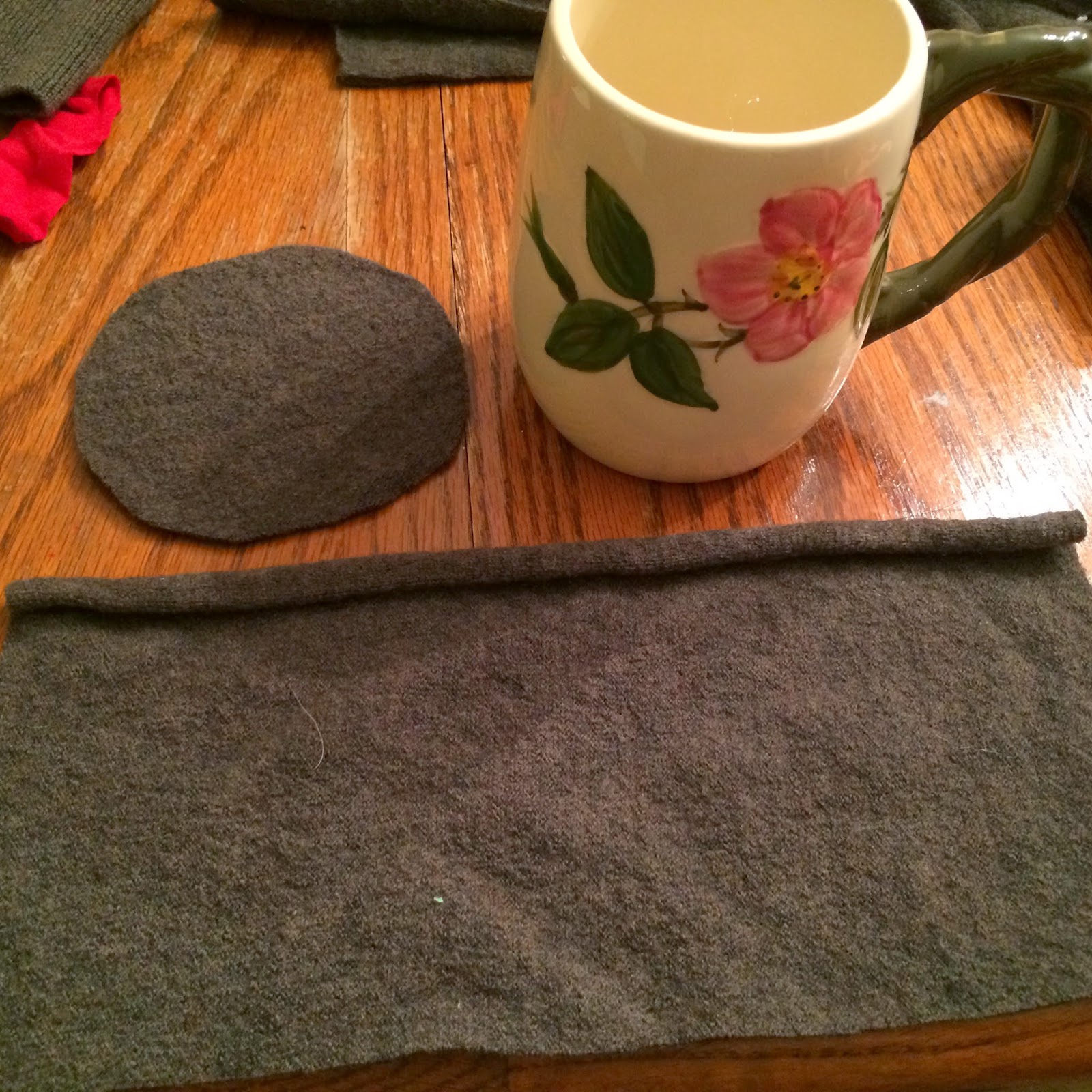 Now, attach the straight bottom of your mug sweater to the circle by sewing it to the circle. Start in the center of the circle and sew to the right attaching the right half of the sweater bottom. Next, sew to the left completing the circle.