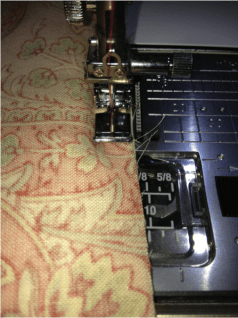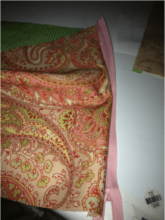 Sew around the entire outside rectangle of the bag Note: as you sew, be certain the zipper–with zipper tape right sides together– is facing down and into the lining.