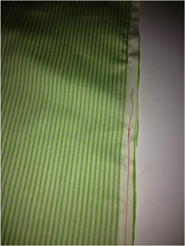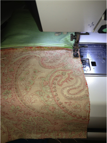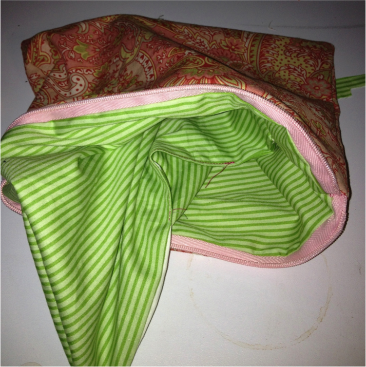 Sew around the entire outside rectangle of the bag Note: as you sew, be certain the zipper–with zipper tape right sides together– is facing down and into the lining.