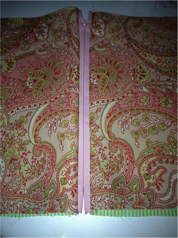 Repeat steps 1 and 2 on the other side of the zipper. Sandwich zipper tape between fabric lining and fabric front, right sides facing one another, being certain the outer fabric is on the outside.