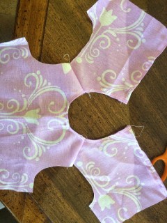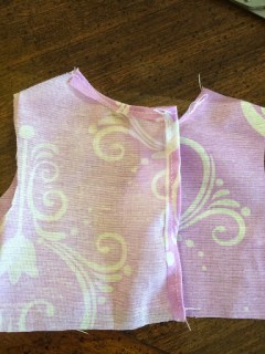 Place front and back bodice pieces right sides together and sew shoulder seams. Hem neck edge by turning under 1/4″ and straight stitching. I don’t worry about finishing the edges of doll clothes, but if you wish, you may use pinking shears or a zig zag stitch to finish the edges before hemming.