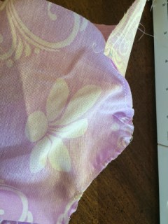 Straight stitch gathered skirt piece to bodice, right sides together.