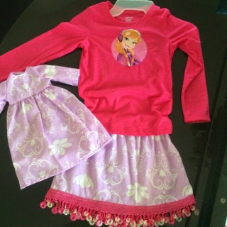Today’s final piece of the Frozen ensemble is a simple to make little girl’s skirt. You can use a pattern, or you can create your own by cutting your material 1 1/2 x hip width and length from waist to hemline plus 3″ for elastic and hem.