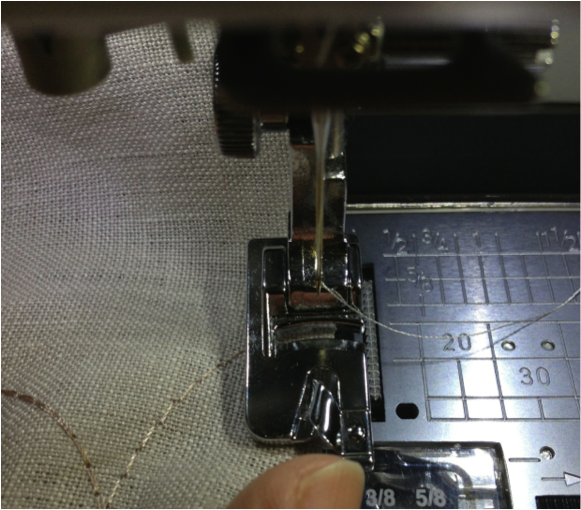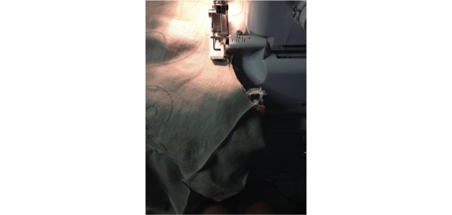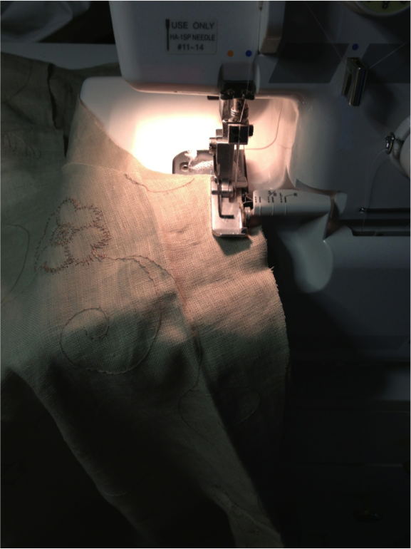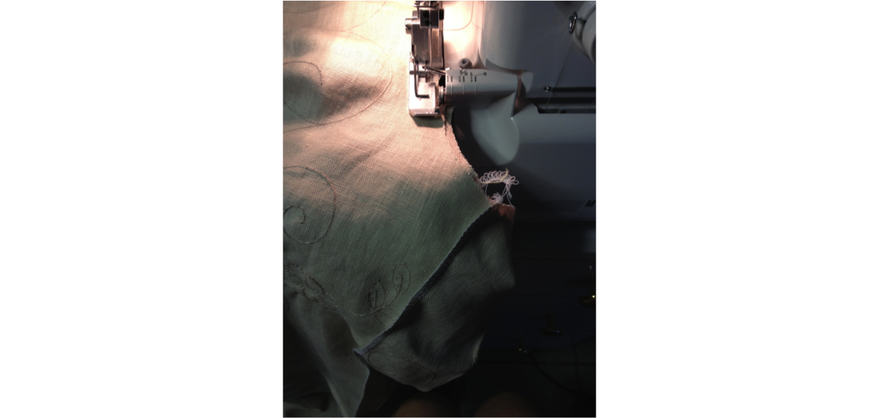 or serge around the bottom edge of pants leg, turn under 1/4″ and straight stitch with conventional machine.