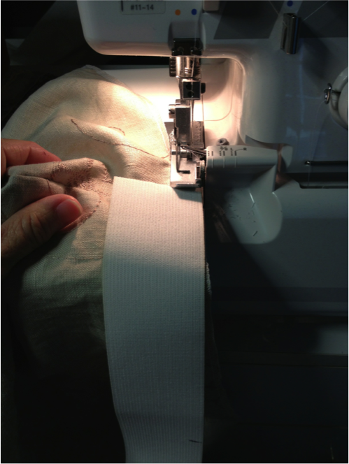 Serge elastic directly to waist, right sides together stretching elastic to meet quarter marks as you go. Turn down and stitch with conventional machine, stretch stitch.