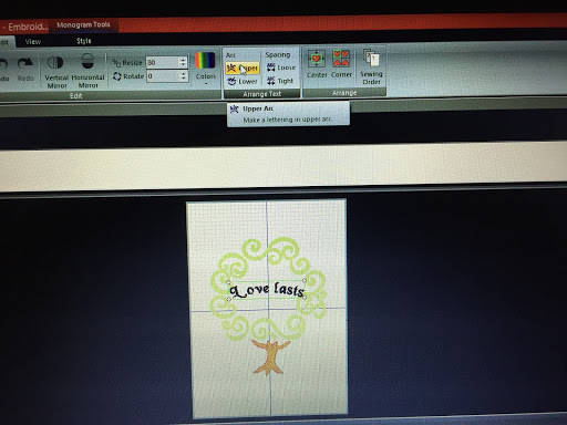 Be certain that you choose the lettering in the design list. Once the lettering box is highlighted, choose Arc and Upper.