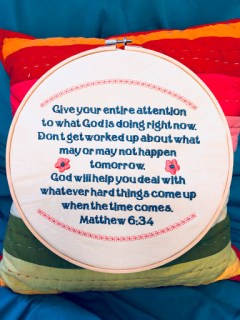 I love this verse, especially in The Message translation. It gives me peace when I’m worried about stuff I don’t have any control over. The free download is available here. I digitized it using Designer’s Gallery Creator, and embroidered it on my fabulous Destiny 2. I hope you enjoy!